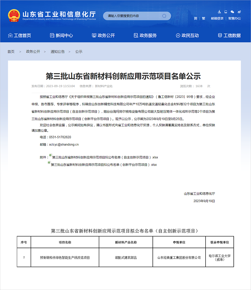 近日,省工業和信息化廳公布了第三批山東省新材料創新應用示范項目名單,經典重工集團股份有限公司申報的“預制鋼構件綠色智能生產線改造項目”成功入選。
