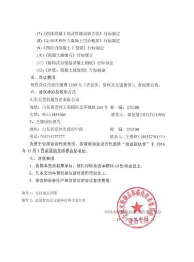 11月7日-9日全國水泥制品標準化技術委員會2014年年會暨標準審查會在山東天意機械股份有限公司隆重召開。屆時,委員會相關領導及行業相關科研人員將蒞臨會議,共同商討制訂行業有關標準。誠邀各界人士屆時蒞臨天意機械、經典集團、卓越精工參觀指導。