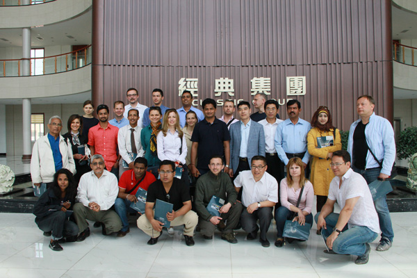 亞歐二十六國政府官員及行業協會領導,不顧勞途奔波,下車后就興致勃勃的參觀了經典集團辦公樓,為其古典與現代結合的優美辦公環境所嘆服,隨后苗董帶領客人一行,參觀了職工活動中心,生產車間,客人詳細了解了車間生產狀況及員工的福利待遇情況,最后在會議中心,集團國際事業部負責人與考察團一行進行了座談,客人一行詳細了解了公司的概況以及海外市場業務進展狀況,集團國際事業部負責人一一解答,座談后與斯里蘭卡貿易和投資促進會秘書長哈尼爾先生(Nihal Aluvihare)及尼泊爾、匈牙利、保加利亞等國簽署了對外貿易合作協議。