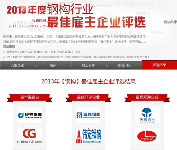 近日,山東經典重工集團股份有限公司在一覽鋼構英才網舉辦的2013年度鋼構行業最佳雇主企業評選中榮獲最幸福企業獎。