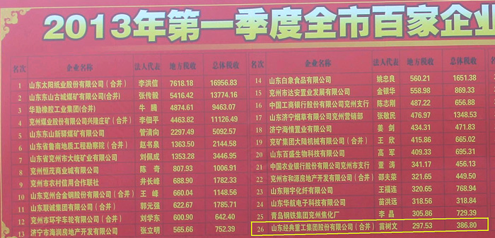 為表彰和宣傳企業(yè)誠(chéng)信納稅,進(jìn)一步扶持企業(yè)做大做強(qiáng),同時(shí)推動(dòng)兗州經(jīng)濟(jì)升級(jí)發(fā)展,近期兗州市對(duì)2013年第一季度納稅50強(qiáng)企業(yè)排行榜進(jìn)行了公示,山東經(jīng)典重工集團(tuán)股份有限公司榮登2013年第一季度兗州納稅五十強(qiáng)企業(yè)排行榜第二十六位。