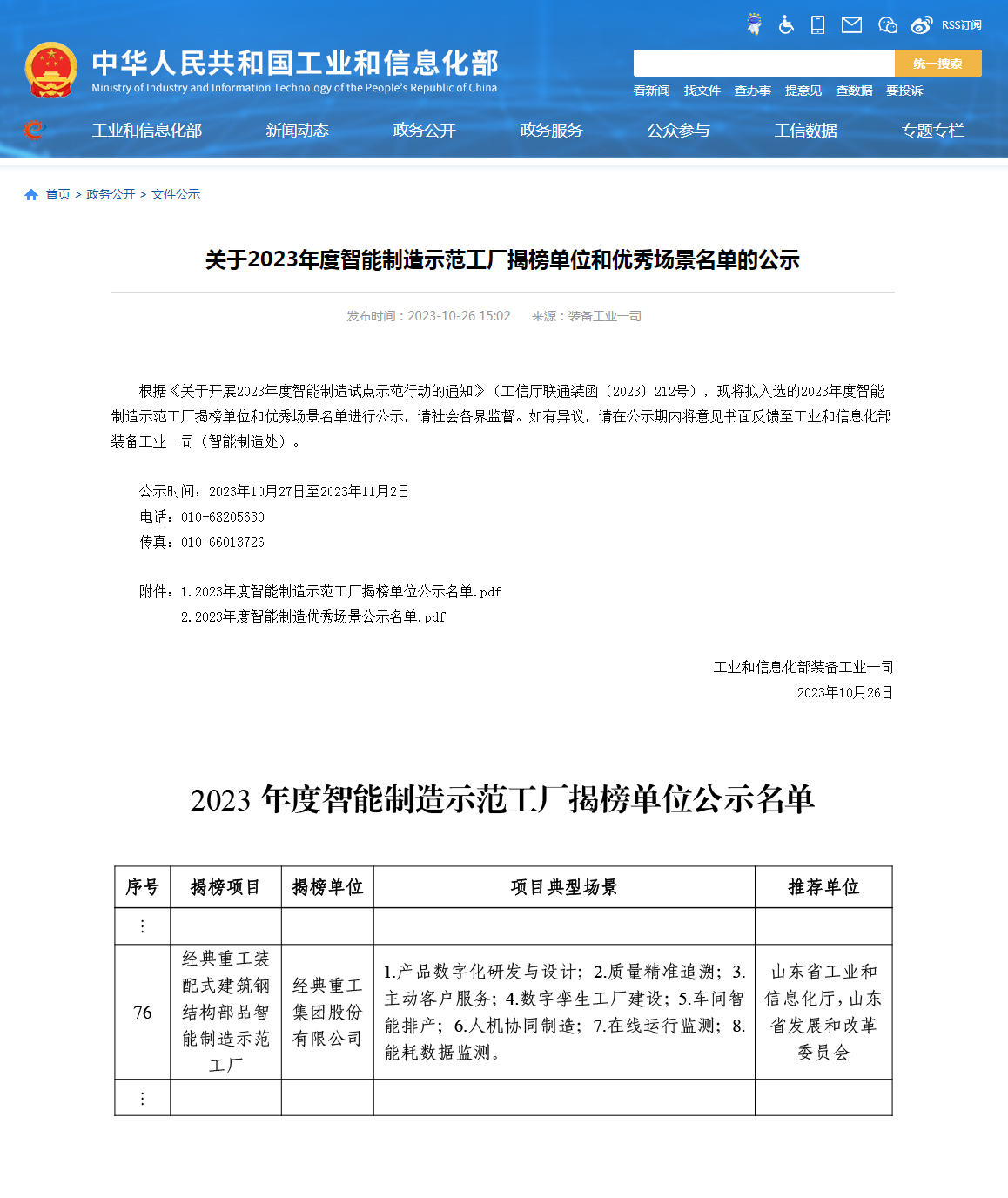 日前,工信部公布了《2023年度智能制造示范工廠揭榜單位名單》,經典重工裝配式建筑鋼結構部品智能制造示范工廠成功入選。